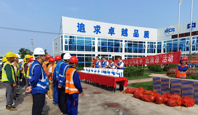 孙才文副总经济师为坚守在高温一线的管理人员及农民工工友们送上了绿豆、藿香正气水、白糖、西瓜等防暑降温品,还送去了公司的关怀和问候。他叮嘱大家要注意自身防护,保证夏季施工安全,严格遵守暑期作业标准和作业纪律,合理安排作业时间;项目部要加大防暑降温的专项培训,消除工友们在“中暑”认识上的盲区与误区,保证夏季施工安全。