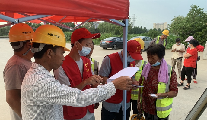 为进一步做好精细化疫情防控,项目部设立志愿服务岗位,组织项目党员骨干、优秀青年,开展疫情防控志愿者服务。每天清晨五点,志愿者们早早来到服务点,开始疫情防控的咨询、防疫检查等服务工作,耐心解答现场人员提出的问题。志愿者们顶着烈日,没有半句怨言,认真细致完成各项防疫检查,做到检查不漏一人,全力以赴打赢这场没有硝烟的战斗。志愿者们在项目部、施工现场对进入项目部人员办事人员、劳务人员进行体温检测、查验行程码、健康码、接种记录、核酸检测报告等并做好登记,对未接种疫苗的劳务人员讲解疫苗接种知识,做好劝返工作。查验信息无异常,才允许进入项目部、工地。志愿者提醒劳务人员要戴口罩、安全帽、穿好反光背心。不少劳务人员不会操作智能手机,志愿者们耐心帮助这些农民工朋友完成行程码、健康码的调取以便于查验,积极做好劳务人员交通引导、秩序维护、人员登记等工作。