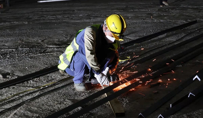 作为一名老手艺人,老李从事自己手中的切割作业已经20多年了。“在很多大项目干过,但修建方舱医院还是第一次。”切割完另一根钢材的老李随口说到,但语气和眼神中似乎透露着淡淡的骄傲和自豪。作为被紧急从项目上征调而来的“精锐”,老李的切割技艺和工作态度也都无愧“精锐”。在他手下,切割机齿轮转动,迅速落位、沉稳切割,火星飞溅瞬间,钢材已变为两截,不一会时间,手边的一捆钢材都已按照需要被切割成完美的长度。