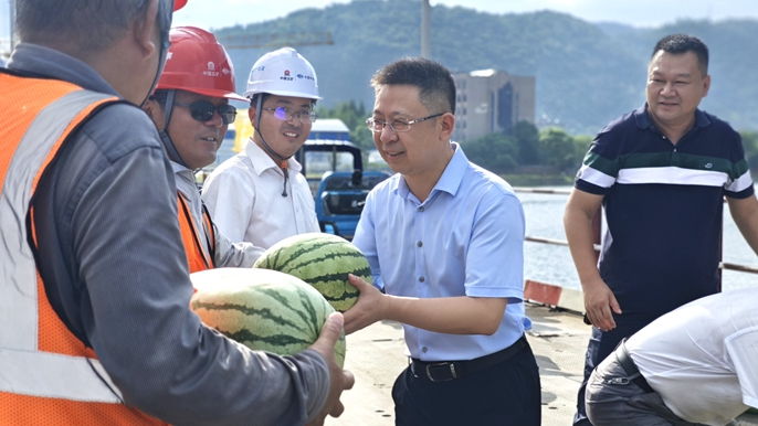 在项目现场,程正栋董事长察看了项目施工进度、安全生产等情况,询问了解了施工挑战与后续计划,对项目团队展现出的专业素养、拼搏精神给予肯定,并将防暑降温物资送到现场管理作业人员手中。他强调,近期天气温度持续攀升,要将项目职工工友健康与安全放在首位,密切关注天气预警信息,严格落实防暑降温措施,科学合理安排作业时间,确保大家能够得到充分的休息调整。