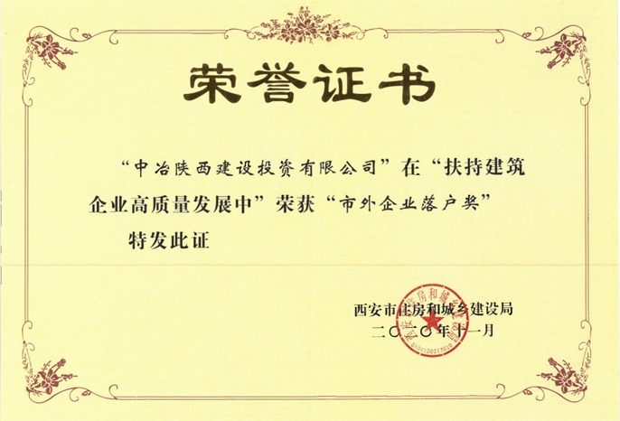 中冶陕投公司获西安建筑业唯一“市外企业落户奖”称号