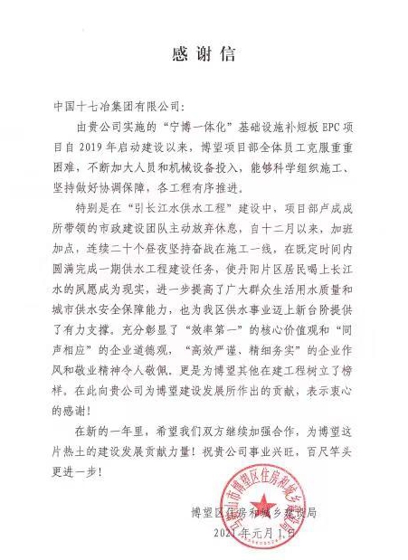 1月1日,马鞍山市博望区住建局向中国十七冶集团致感谢信并赠送锦旗,对十七冶管廊分公司“宁博一体化”基础设施补短板EPC总承包项目部长江引水工程团队展现的“优良的工作作风,崇高的工作精神”致以高度赞扬和诚挚感谢。