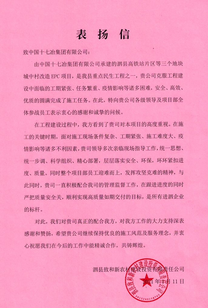 1月11日,泗县致和新农村建设投资有限责任公司向中国十七冶集团致表扬信,对南京分公司圆满完成泗县高铁站片区等三个地块城中村改造施工任务提出表扬。